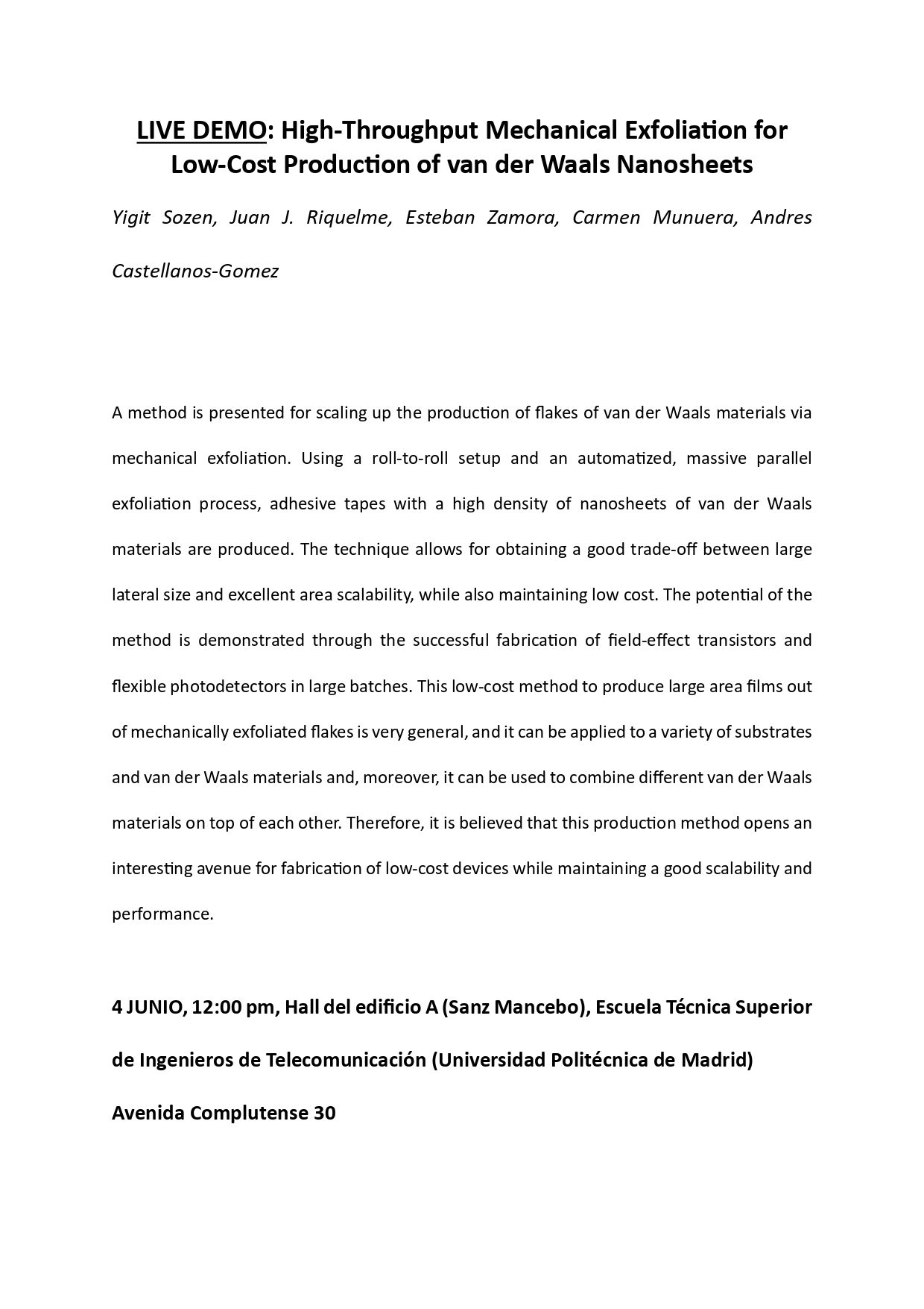 Yigit Sozen, Juan J. Riquelme, Esteban Zamora, Carmen Munuera y Andres Castellanos-Gomez, investigadores del 2d Foundry del Instituto de Ciencia de Materiales de Madrid (Consejo Superior de Investigaciones Científicas), ofrecerán una demostración en directo sobre uno de los montajes experimentales que han desarrollado para la producción a gran escala y bajo coste de materiales 2D. Aquí tenéis su resumen del evento e información de la localización del mismo.