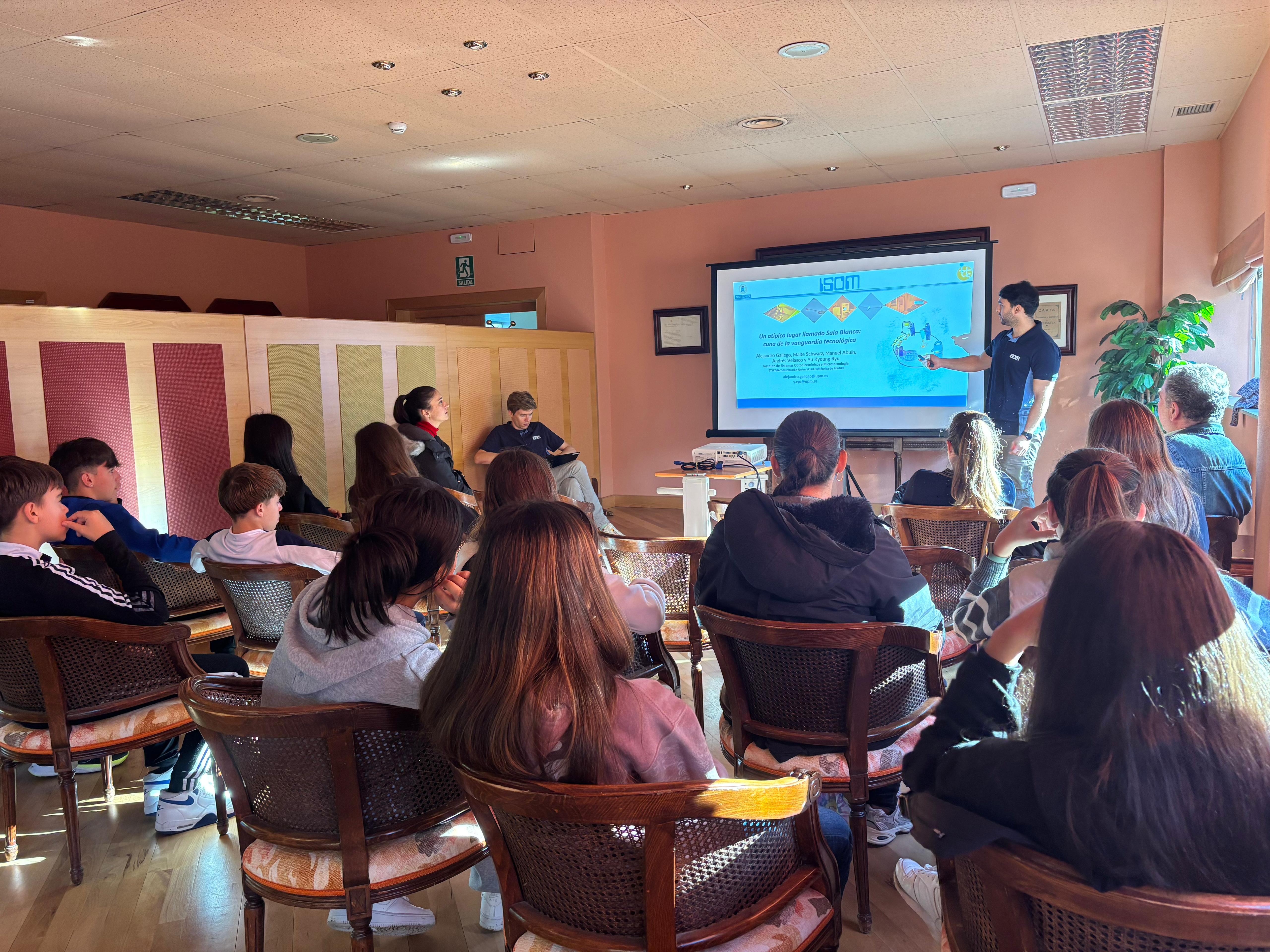 Primero se hizo una breve presentación a los alumnos visitantes sobre la sala blanca: concepto, contenido, peculiaridades; sobre el papel fundamental de la sala blanca para la fabricación y caracterización de todos los dispositivos que nos rodean todos los días y en todas partes. A continuación, el público disfrutó de una visita guiada a la sala blanca y a los laboratorios del ISOM.