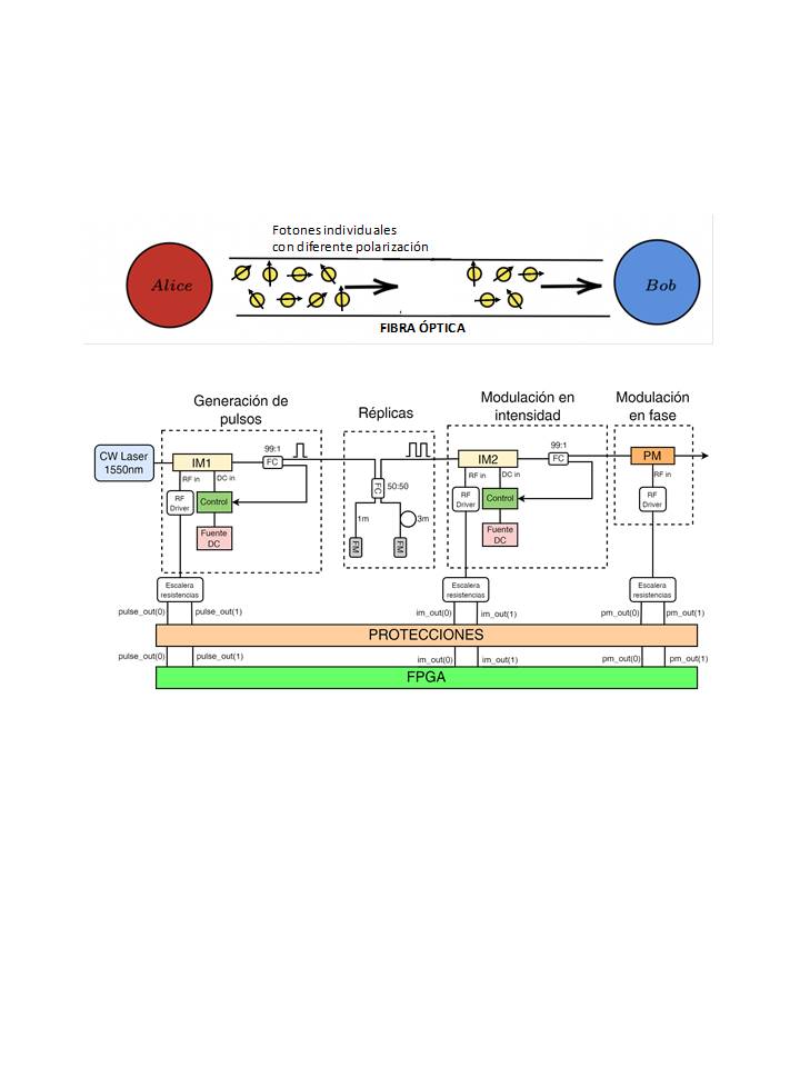 Diseño de un sistema de intercambio de claves cuánticas. En particular, el sincronismo del sistema mediante FPGAs y el diseño y montaje de las interfaces entre la FPGA y los elementos ópticos del sistema. Desarrollo de placas de circuito impreso, circuitos electrónicos y control de elementos electro-ópticos empleando arquitecturas digitales basadas en FPGAs.
